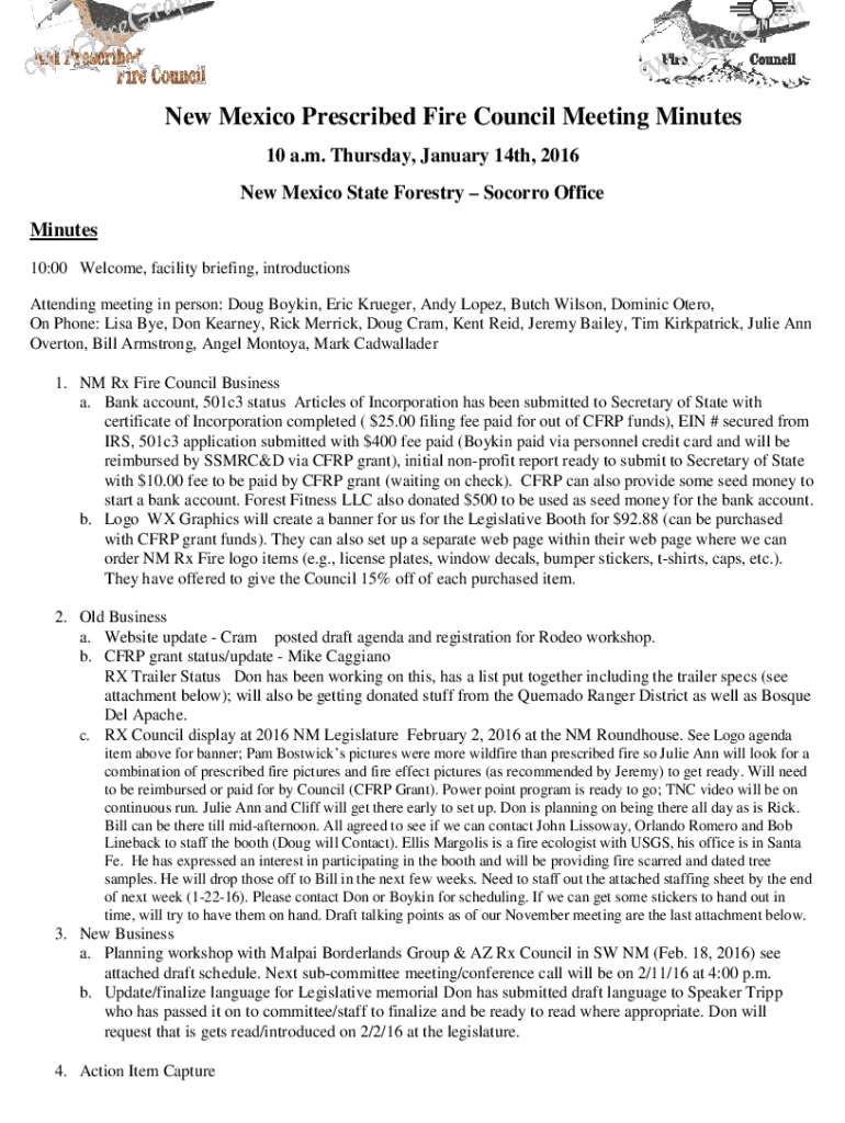New Mexico Prescribed Fire Council Meeting Minutes 10 a.m. Thursday, January 14th, 2016 New Mexico State Forestry Socorro Office Minutes 10:00 Welcome, facility briefing, introductions Attending meeting