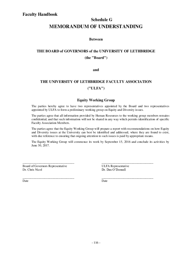 Faculty Handbook Schedule MEMORANDUM OF UNDERSTANDING Between THE BOARD of GOVERNORS of the UNIVERSITY OF LETHBRIDGE (the \” Board\”) and THE UNIVERSITY OF LETHBRIDGE FACULTY ASSOCIATION (\”