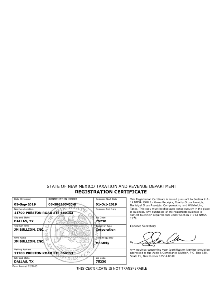 Audit & Compliance Division Albuquerque District Michelle Lujan Grisham Governor Stephanie Hardin Clarke Cabinet SecretaryROBERT E. BARLEY, JR. JM BULLION, INC. 11700 PRESTON ROAD STE 660153 DALLAS,