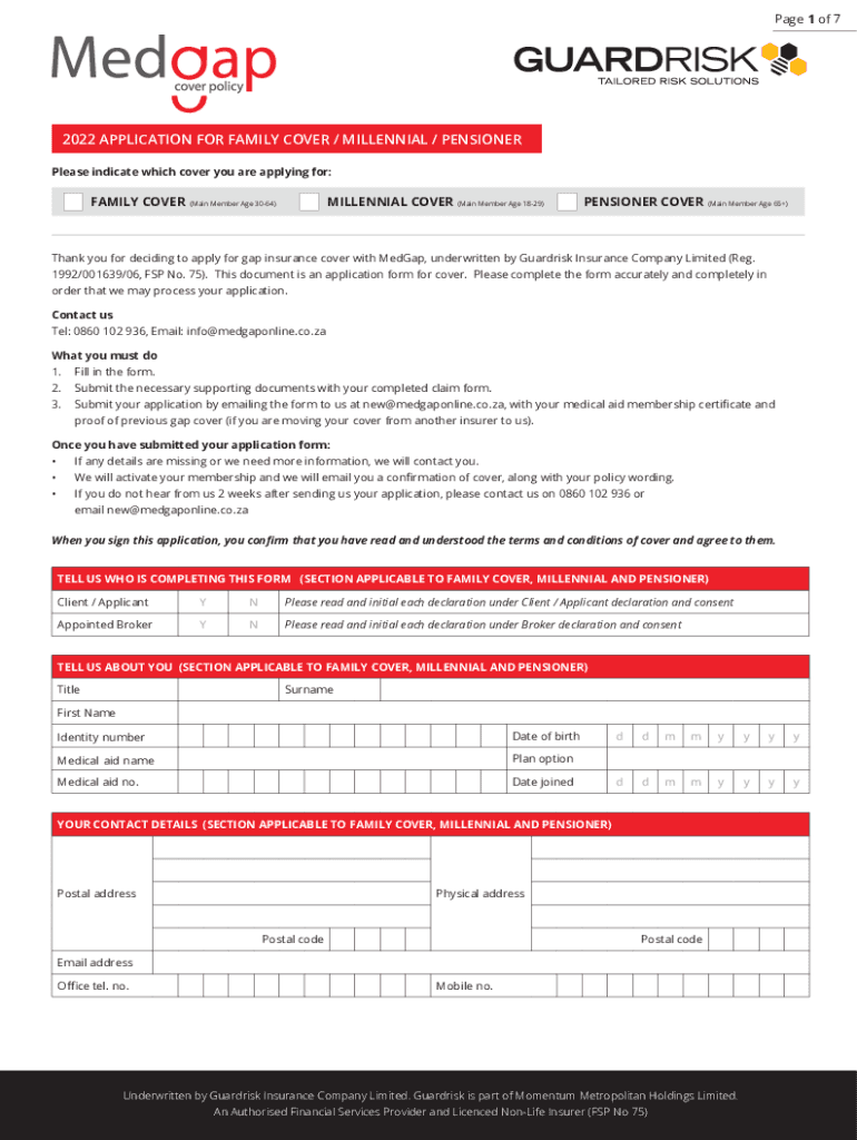 Page 1 of 72022 APPLICATION FOR FAMILY COVER / MILLENNIAL / PENSIONER Please indicate which cover you are applying for:FAMILY COVERMILLENNIAL COVER (Main Member Age 1829)(Main Member Age 3064)PENSIONER
