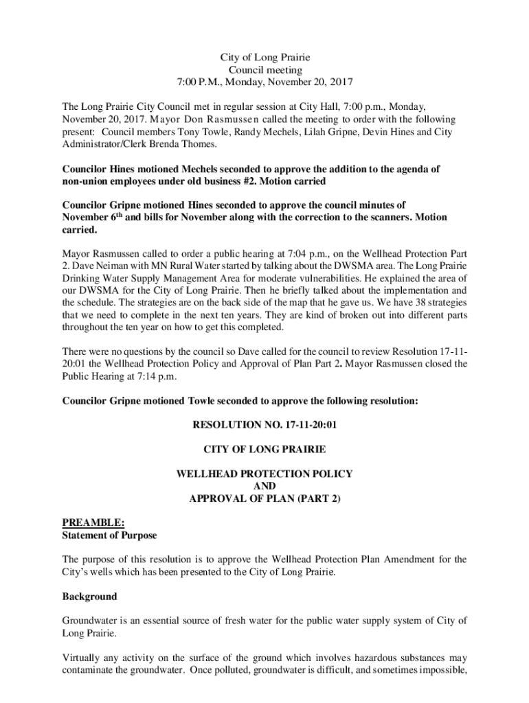 The Long Prairie City Council met in regular session at City Hall, 7:00 p.m., Monday,