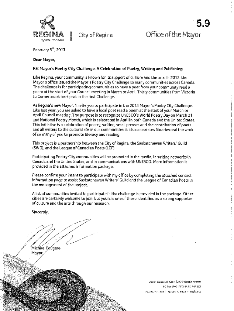 5.9RGINAICity of ReginaOFfice of the MayorInJnite Horizons February 5th, 2013 Dear Mayor're: Mayor\'s Poetry City Challenge: A Celebration of Poetry, Writing and Publishing Like Regina, Your community
