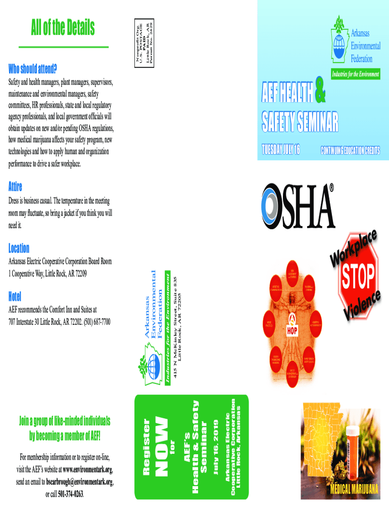 Who should attend? Nonprofit Org. U.S. POSTAGE PAID Little Rock, AR Permit No. 2429All of the Details AEF HEALTH & SAFETY SEMINARSafety and health managers, plant managers, supervisors, maintenance