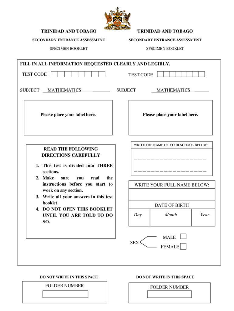 TRINIDAD AND TOBAGOTRINIDAD AND TOBAGOSECONDARY ENTRANCE ASSESSMENTSECONDARY ENTRANCE ASSESSMENTSPECIMEN BOOKLETSPECIMEN BOOKLETFILL IN ALL INFORMATION REQUESTED CLEARLY AND LEGIBLY. TEST CODE SUBJECTS