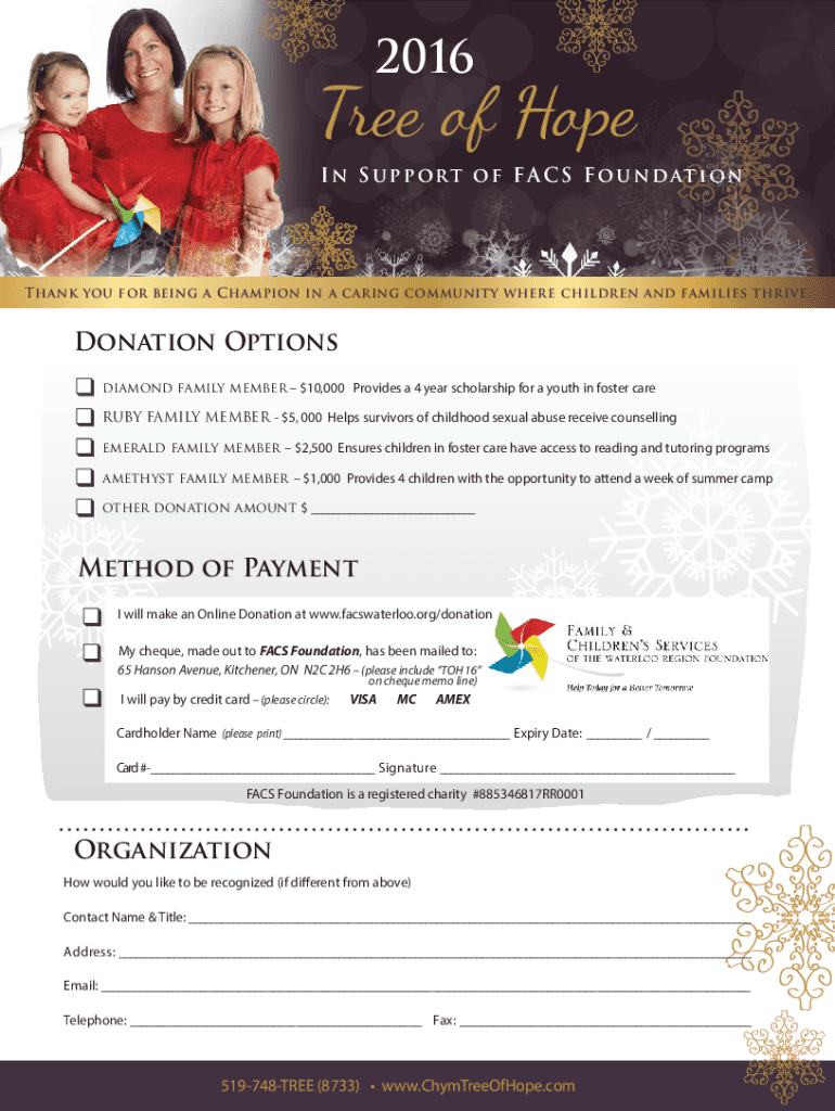 2016Tree of Hope I n S u p p o r t o f F A C S F o u n d at i on Thank you for being a Champion in a caring community where children and families thrive. Donation Options diamond family member $10,000