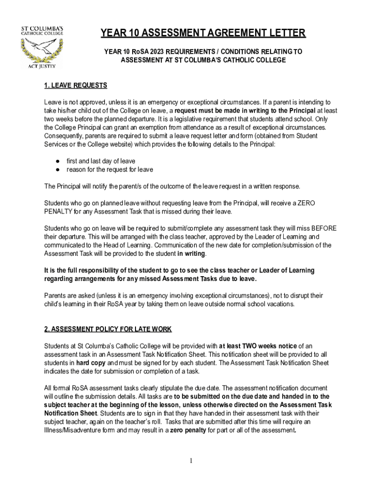 YEAR 10 ASSESSMENT AGREEMENT LETTER YEAR 10 Rosa 2023 REQUIREMENTS / CONDITIONS RELATING TO ASSESSMENT AT ST COLUMBUS CATHOLIC COLLEGE 1. LEAVE REQUESTS Leave is not approved, unless it is an emergency