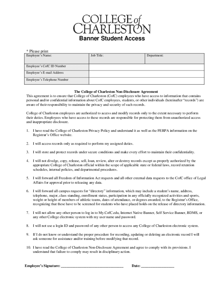 Banner Student Access * Please print Employees Name:Job Title:Department:Employees CFC ID Number Employees Email Address Employees Telephone Number College of Charleston Nondisclosure Agreement This