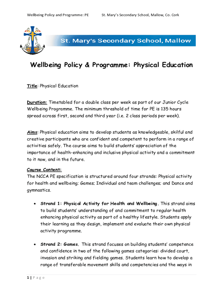 Wellbeing Policy and Program: Pest. Mary's Secondary School, Mallow, Co. CorkWellbeing Policy & Program: Physical Education Title: Physical Education Duration: Timetabled for a double class per week