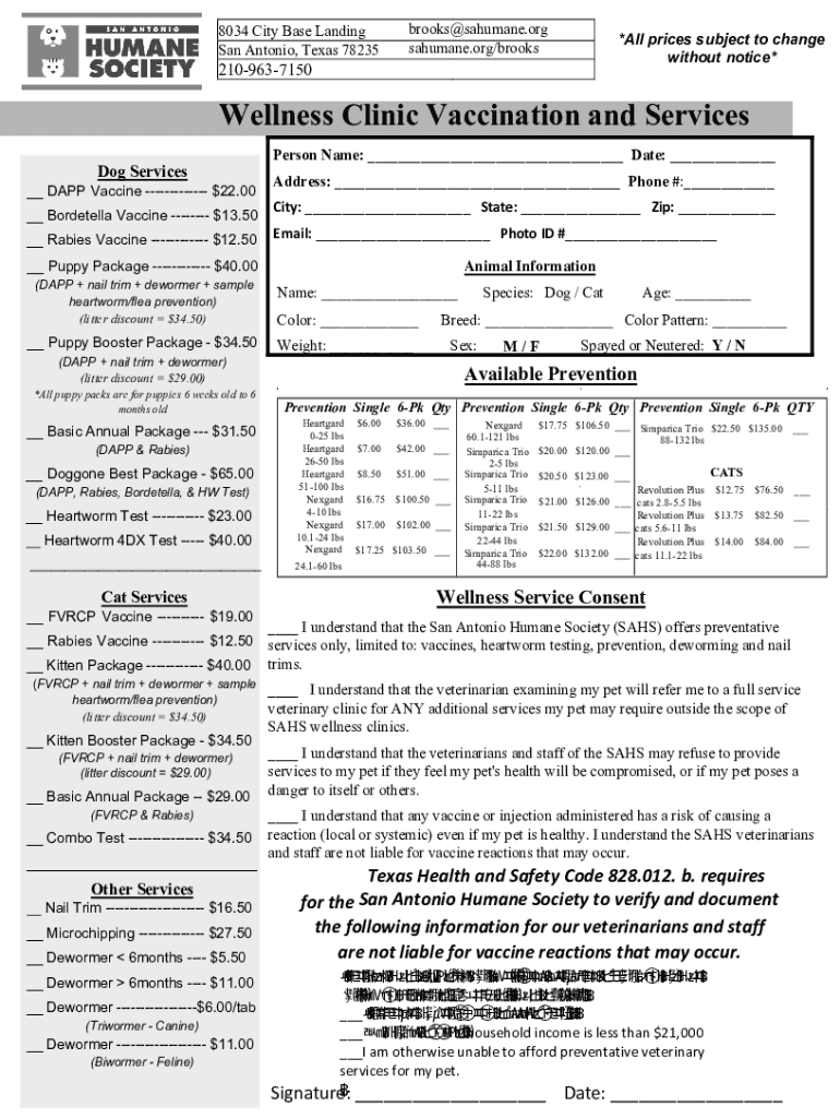 8034 City Base Landing San Antonio, Texas 782352109637150brooks@sahumane.org sahumane.org/brooks×All prices subject to change without notice×Wellness Clinic Vaccination and Services Dog Services__