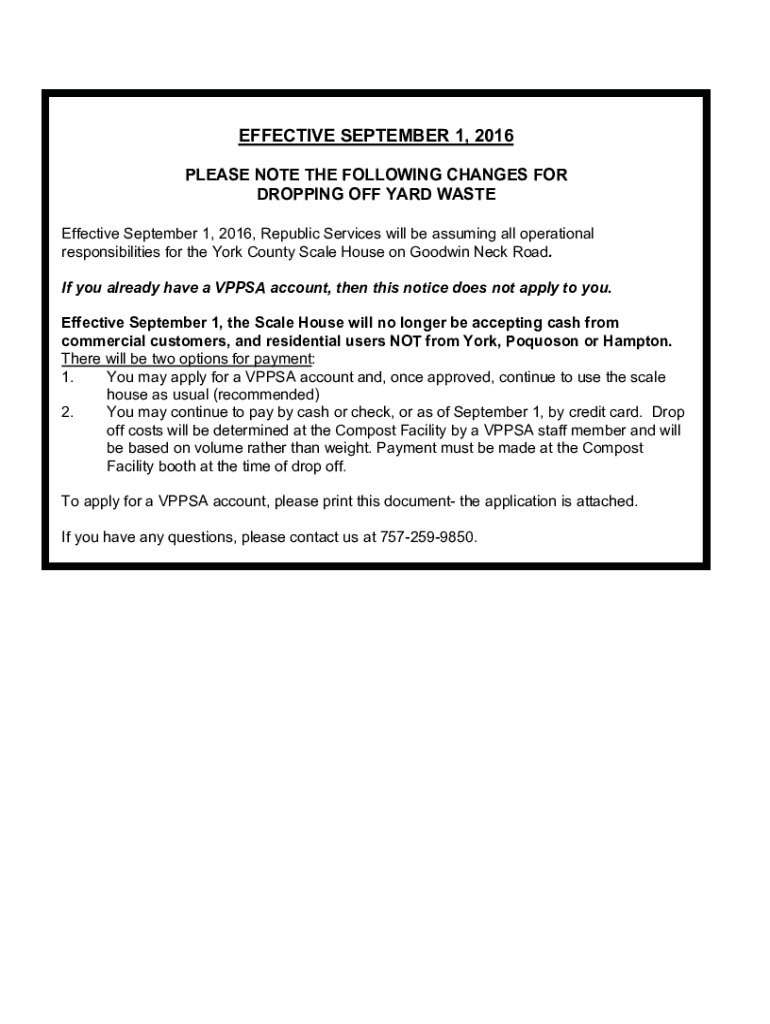 EFFECTIVE SEPTEMBER 1, 2016, PLEASE NOTE THE FOLLOWING CHANGES FOR DROPPING OFF YARD WASTE Effective September 1, 2016, Republic Services will be assuming all operational responsibilities for the