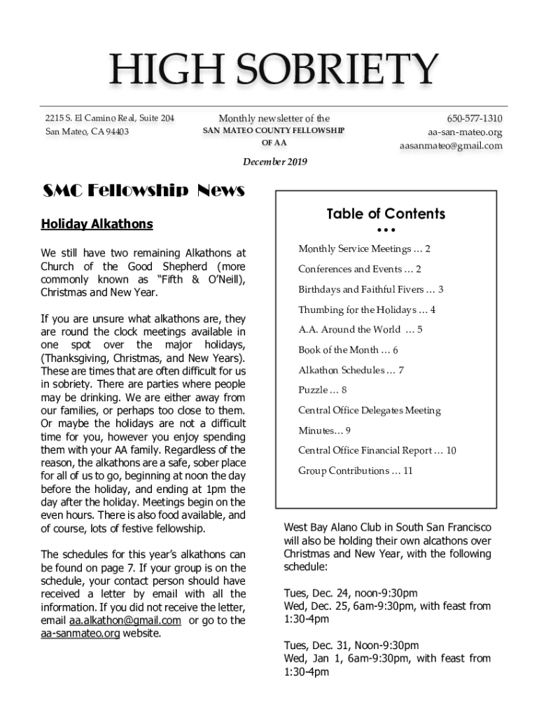 HIGH SOBRIETY 2215 S. El Camino Real, Suite 204 San Mateo, CA 94403Monthly newsletter of the6505771310 aasanmateo.org aasanmateo@gmail.comSAN MATEO COUNTY FELLOWSHIP OF AA December 2019SMC Fellowship