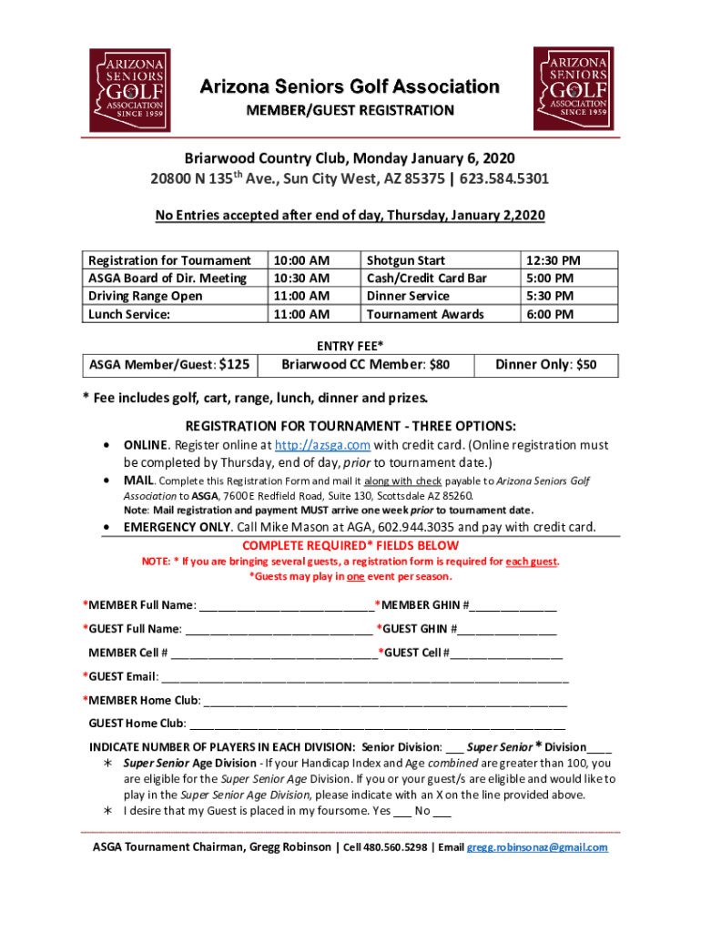 Braidwood Country Club, Monday, January 6, 2020 20800 N 135th Ave., Sun City West, AZ 85375 | 623.584.5301 No Entries accepted after end of day, Thursday, January 2,2020, Registration for Tournament
