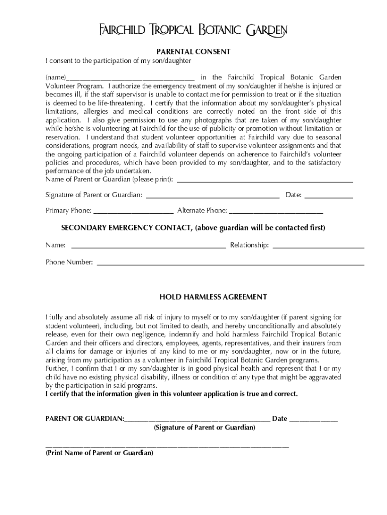 PARENTAL CONSENT to the participation of my son/daughter(name)___ in the Fair child Tropical Botanic Garden Volunteer Program. I authorize the emergency treatment of my son/daughter if he/she is injured