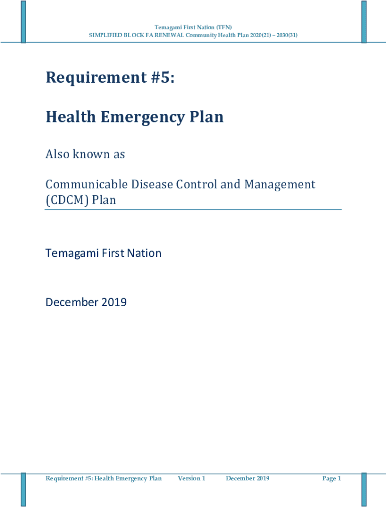 SIMPLIFIED BLOCK FA RENEWAL Community Health Plan 2020(21) 2030(31)Requirement #5:Health Emergency Plans known communicable Disease Control and Management(CDC) PlanTemagami
