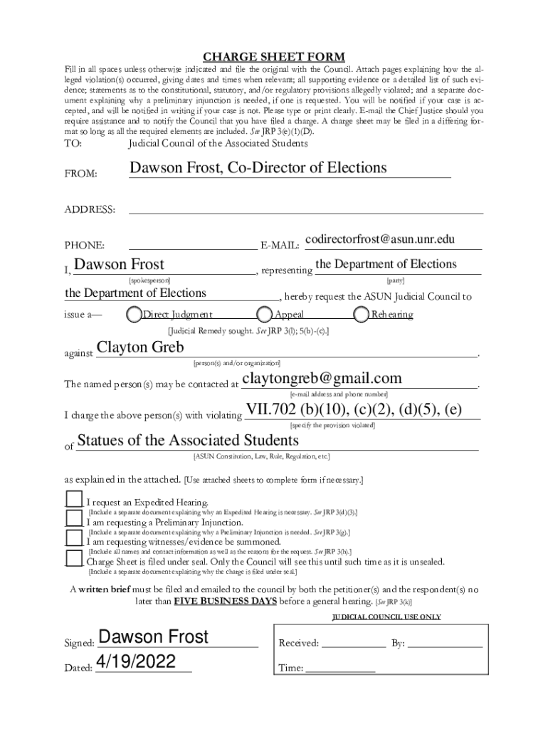 CHARGE SHEET Formerly in all spaces unless otherwise indicated and file the original with the Council. Attach pages explaining how the alleged violation(s) occurred, giving dates and times when relevant;