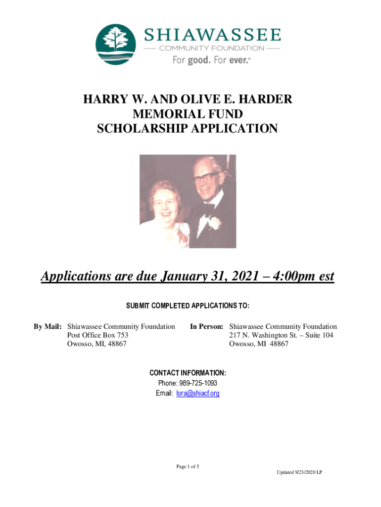 HARRY W. AND OLIVE E. HARDER MEMORIAL FUND SCHOLARSHIP APPLICATIONApplications are due January 31, 2021 4:00pm est SUBMIT COMPLETED APPLICATIONS TO: By Mail: Shiawassee Community Foundation Post Office