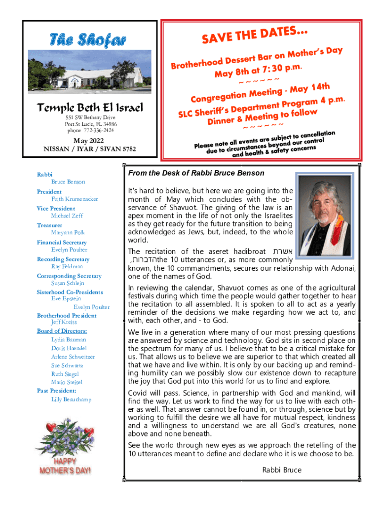 The ShofarTemple Beth El Israel 551 SW Bethany Drive Port St Lucie, FL 34986 phone 7723362424May 2022NISSAN / IYAR / SIVAN 5782Rabbi Bruce Benson President Faith Krumenacker Vice President Michael