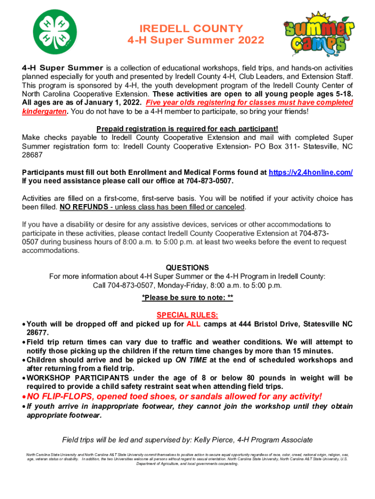 IREDELL COUNTY 4H Super Summer 2022 4H Super Summer is a collection of educational workshops, field trips, and Hanson activities planned especially for youth and presented by Iredell County 4H, Club