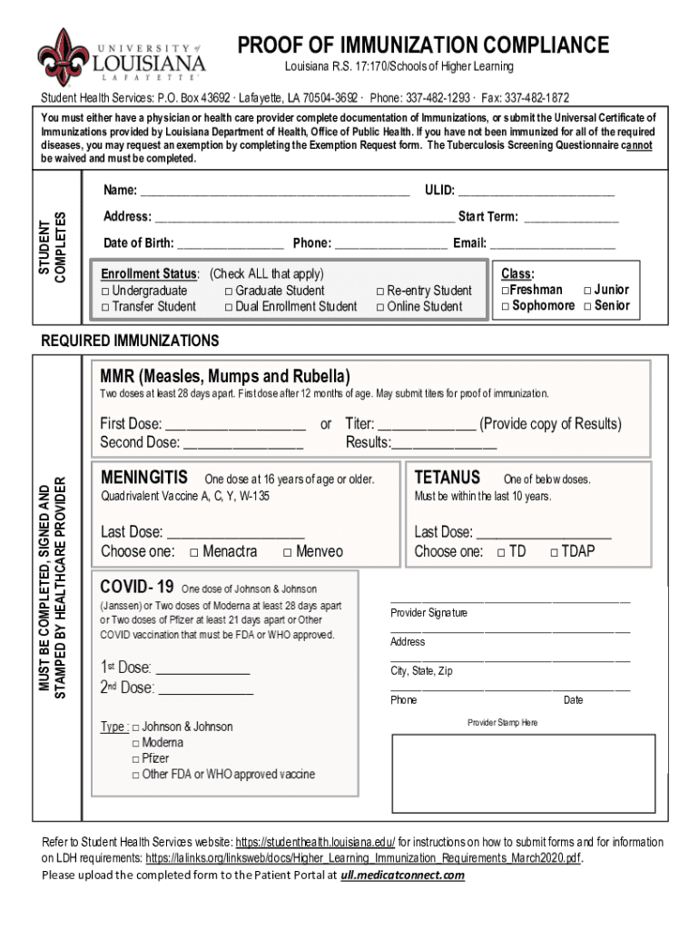 Get the free Immunization Compliance form - Student Health Services - studenthealth louisiana