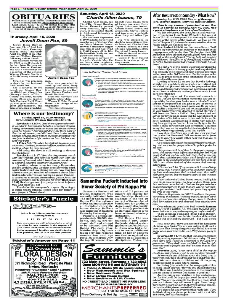 Page 6, The Still County Tribune, Wednesday, April 22, 2020OBITUARIES Printed free as a public service. Contact the funeral home to have an obituary included. Photos included at no charge. Local obituary