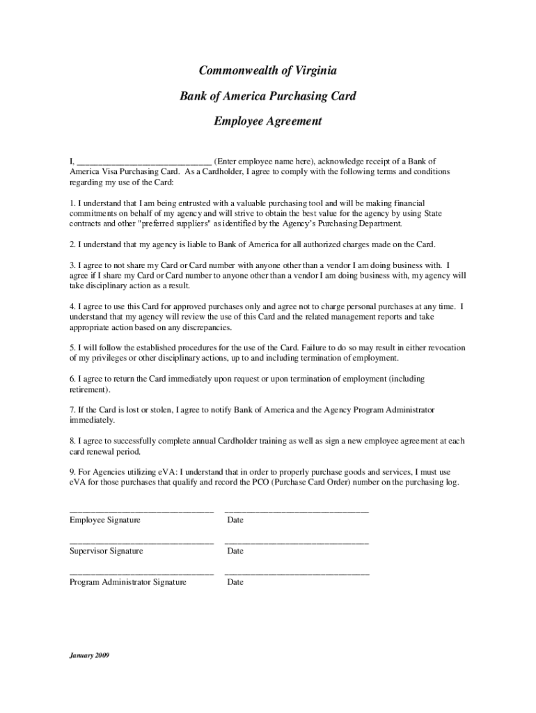 Commonwealth of Virginia Bank of America Purchasing Card Employee Agreement I, ___ (Enter employee name here), acknowledge receipt of a Bank of America Visa Purchasing Card. As a Cardholder, I agree