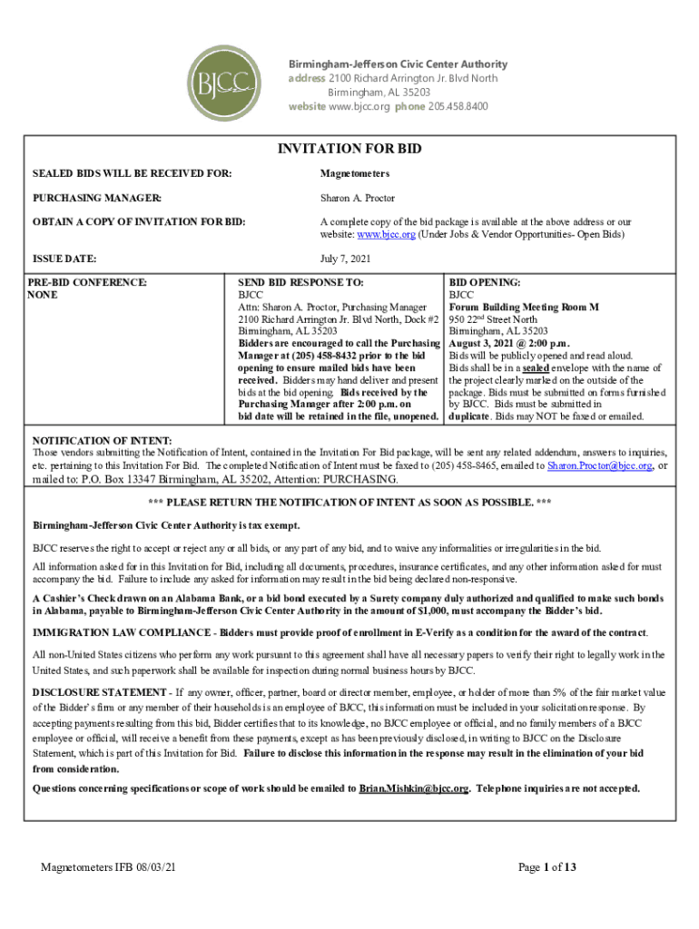 Birmingham Jefferson Civic Center Authority address 2100 Richard Arrington Jr. Blvd North Birmingham, AL 35203 website www.bjcc.org phone 205.458.8400INVITATION FOR BID SEALED BIDS WILL BE RECEIVED