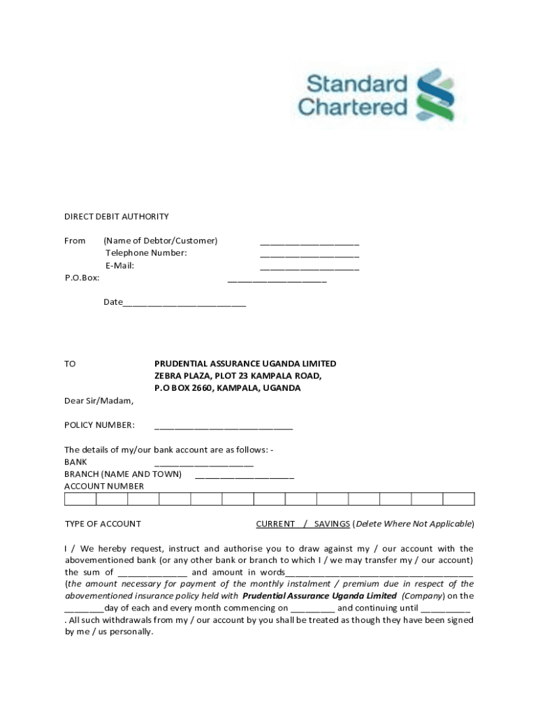 DIRECT DEBIT AUTHORITY From(Name of Debtor/Customer) Telephone Number: Email:P.O. Box:___ ___ ___ ___Date___TOPRUDENTIAL ASSURANCE UGANDA LIMITED ZEBRA PLAZA, PLOT 23 KAMPALA ROAD, P. O BOX 2660,