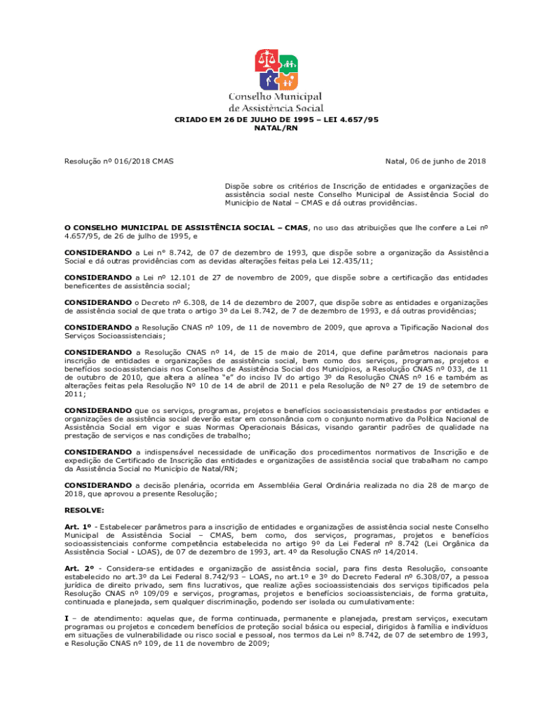 NATAL/RNResoluo n 016/2018 Coastal, 06 de Juno de 2018Dispe sober OS critics DE Inscribe DE enfilades e organizes DE