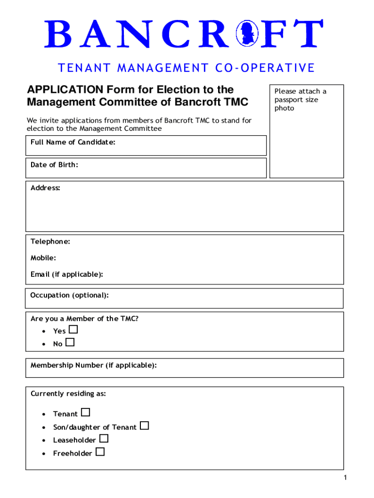 BA NCR FT TENANT MANAGEMENT CO OPERATIVE APPLICATION Form for Election to the Management Committee of Bancroft Please attach a passport size photo invite applications from members of Bancroft TMC