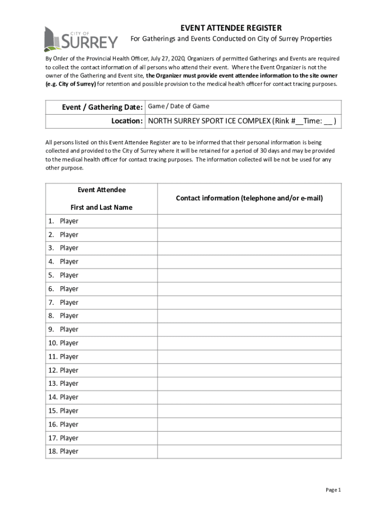 EVENT ATTENDEE REGISTER For Gatherings and Events Conducted on City of Surrey Proper9es By Order of the Provincial Health Over, July 27, 2020, Organizers of permitted Gatherings and Events are required