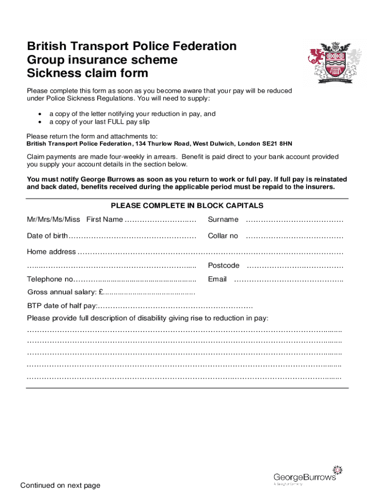 British Transport Police Federation Group insurance scheme Sickness claim form Please complete this form as soon as you become aware that your pay will be reduced under Police Sickness Regulations.