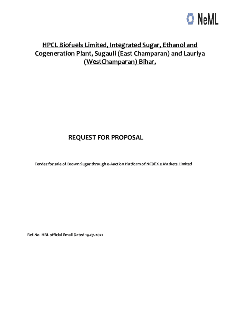 (WestChamparan) Bihar, REQUEST FOR PROPOSALTender for sale of Brown Sugar through auction