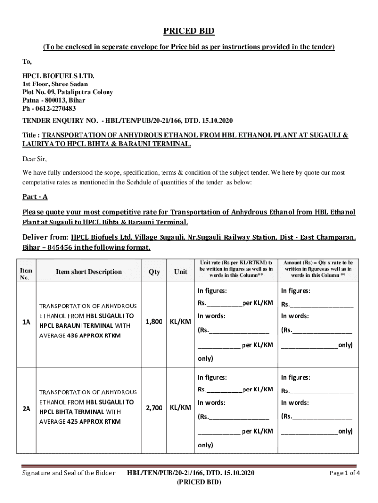 PRICED BID (To be enclosed in separate envelope for Price bid as per instructions provided in the tender) To, HCL BIOFUELS LTD. 1st Floor, Three Sudan Plot No. 09, Pataliputra Colony Patna 800013,
