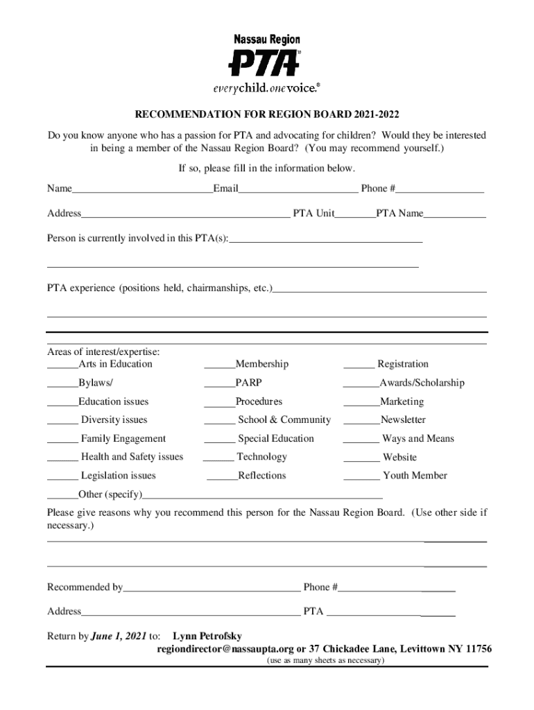 RECOMMENDATION FOR REGION BOARD 20212022 Do you know anyone who has a passion for PTA and advocating for children? Would they be interested in being a member of the Nassau Region Board? (You may recommend