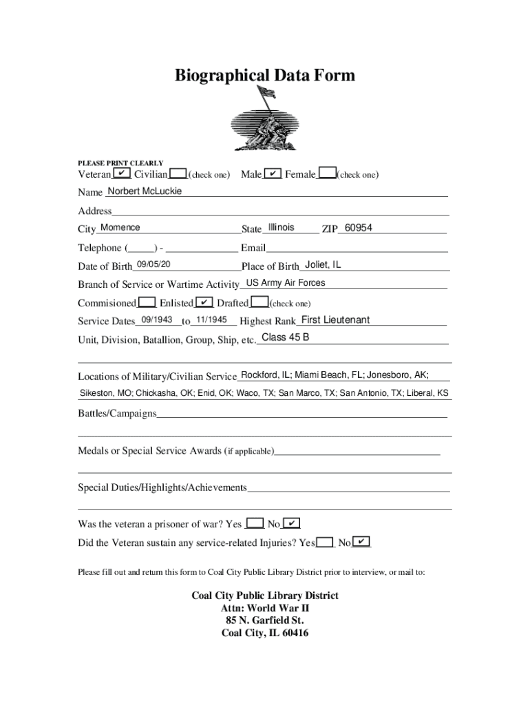 Biographical Data Formulas PRINT CLEARLY Civilian___(check Veteran___one) Female___(check one) Male___Norbert Mickie Name ___Address___ Illinois Moment 60954 City___State___ ZIP___Telephone (___)