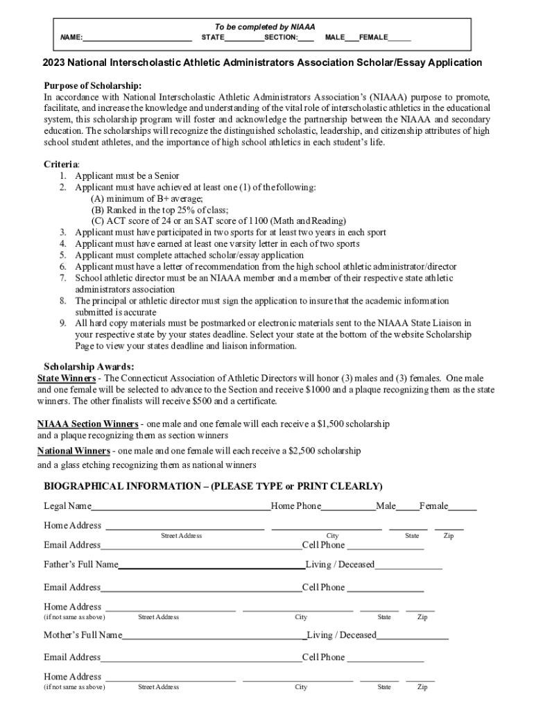To be completed by NIAAASTATENAME:SECTION:MALEFEMALE2023 National Interscholastic Athletic Administrators Association Scholar/Essay Application Purpose of Scholarship: In accordance with National