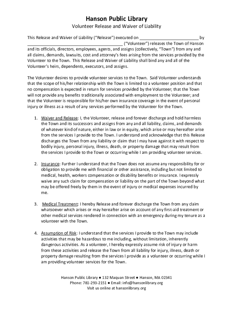 Hanson Public Library Volunteer Release and Waiver of Liability This Release and Waiver of Liability (Release) executed on ___ by ___ (Volunteer) releases the Town of Hanson and its officials, directors,