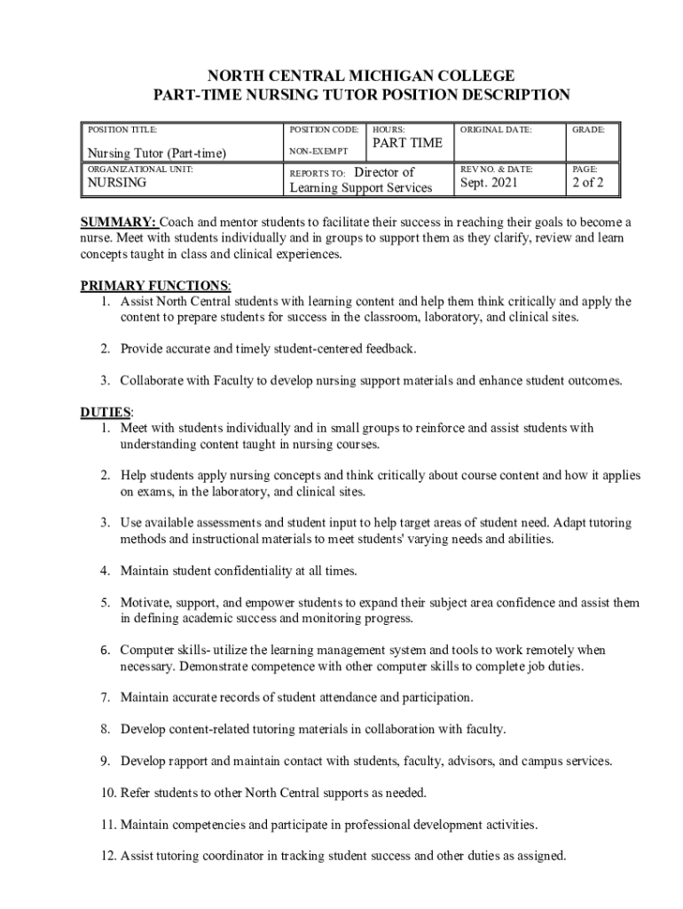 NORTH CENTRAL MICHIGAN COLLEGE PART TIME NURSING TUTOR POSITION DESCRIPTION POSITION TITLE:POSITION CODE:Nursing Tutor (Part time)NONEXEMPTORGANIZATIONAL UNIT:REPORTS TO:NURSINGHOURS:ORIGINAL DATE:GRADE:REV
