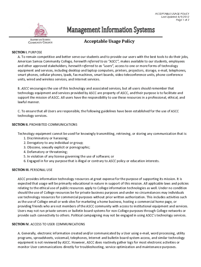 ACCEPTABLE USAGE POLICY Last Updated: 8/9/2012-Page 1 of 2Acceptable Usage PolicySECTIONI.PURPOSE A. Toremaincompetitiveandbetterserveourstudentsandtoprovideouruserswiththebesttoolstodotheirjobs,