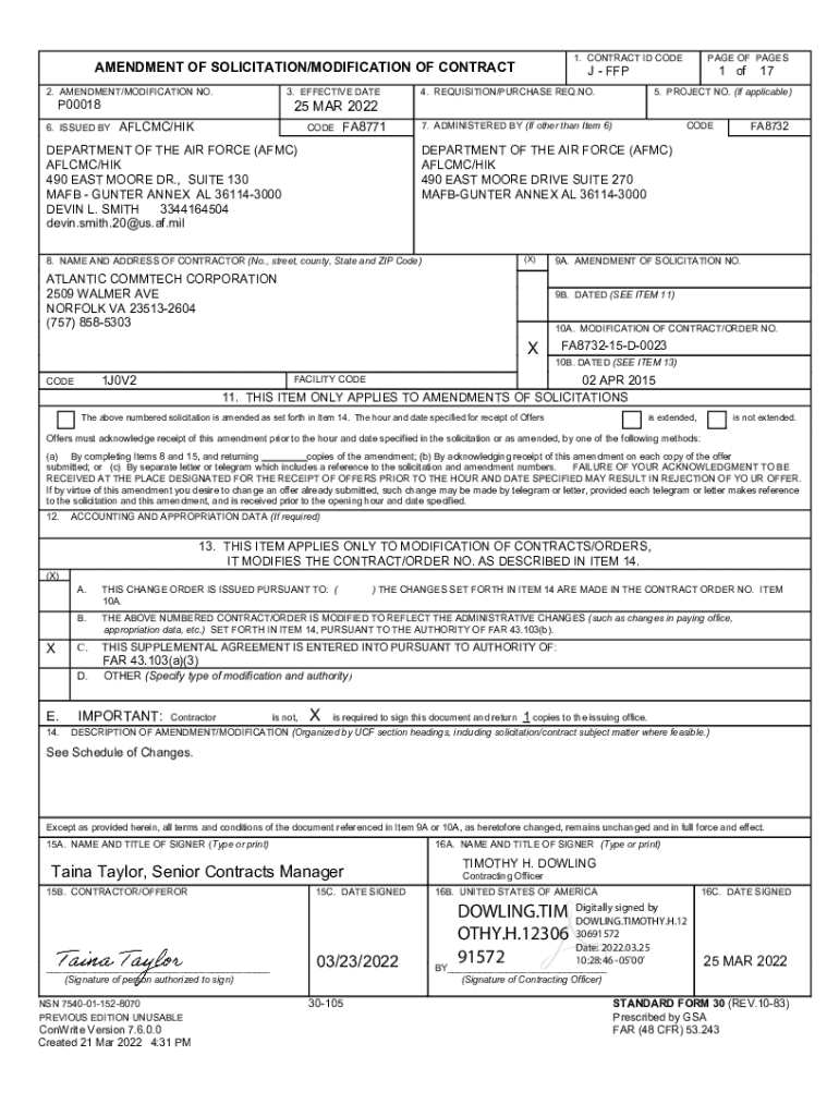 1. CONTRACT ID CODEPENDENT OF SOLICITATION/MODIFICATION OF CONTRACT 2. AMENDMENT/MODIFICATION NO.3. EFFECTIVE DATE25 MAR 2022P00018 6. ISSUED BYAFLCMC/HIKCODEFA8771DEPARTMENT OF THE AIR FORCE (AFC)