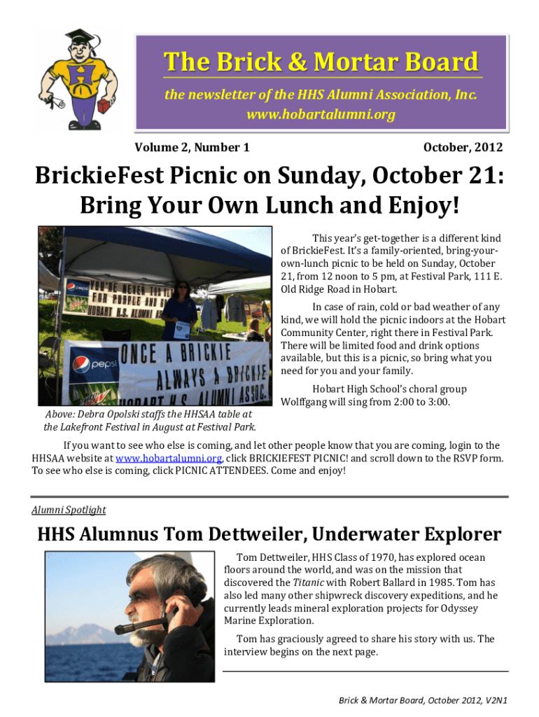 The Brick & Mortar Board the newsletter of the HHS Alumni Association, Inc. www.hobartalumni.org Volume 2, Number 1October, 2012BrickieFest Picnic on Sunday, October 21: Bring Your Own Lunch and Enjoy!