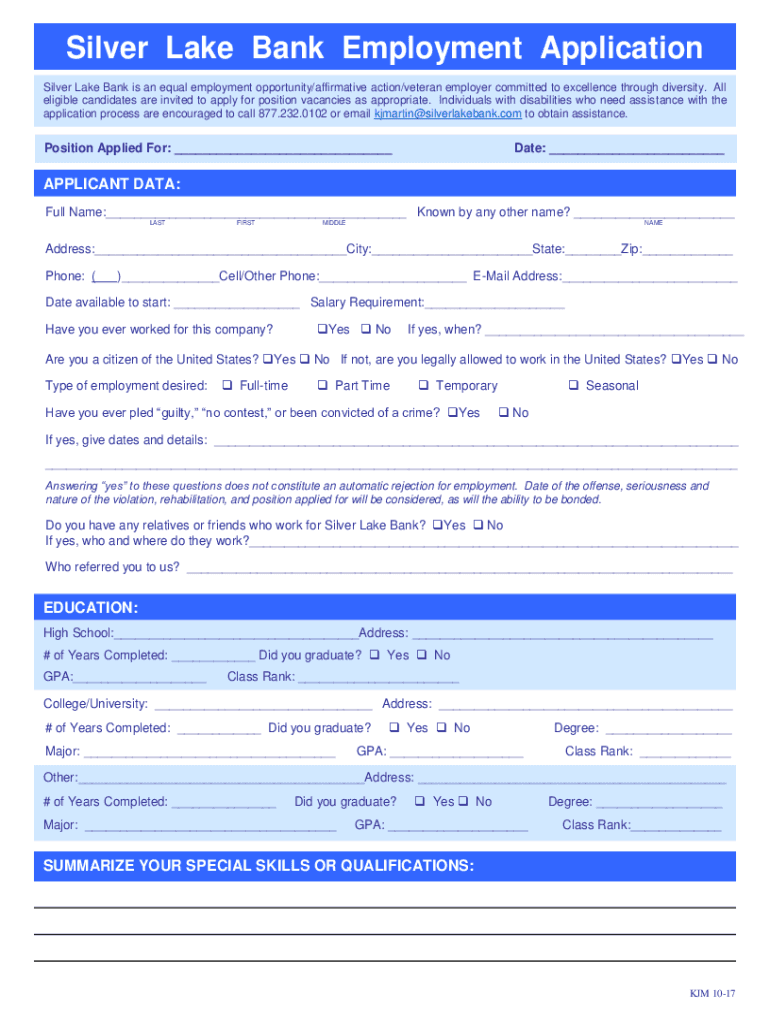 Silver Lake Bank Employment Application Silver Lake Bank is an equal employment opportunity/affirmative action/veteran employer committed to excellence through diversity. All eligible candidates are