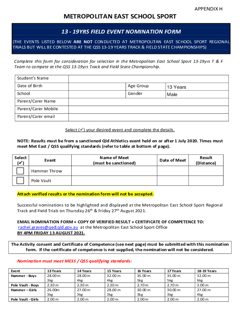 METROPOLITAN EAST SCHOOL SPORTAPPENDIX H13 19YRS FIELD EVENT NOMINATION FORM