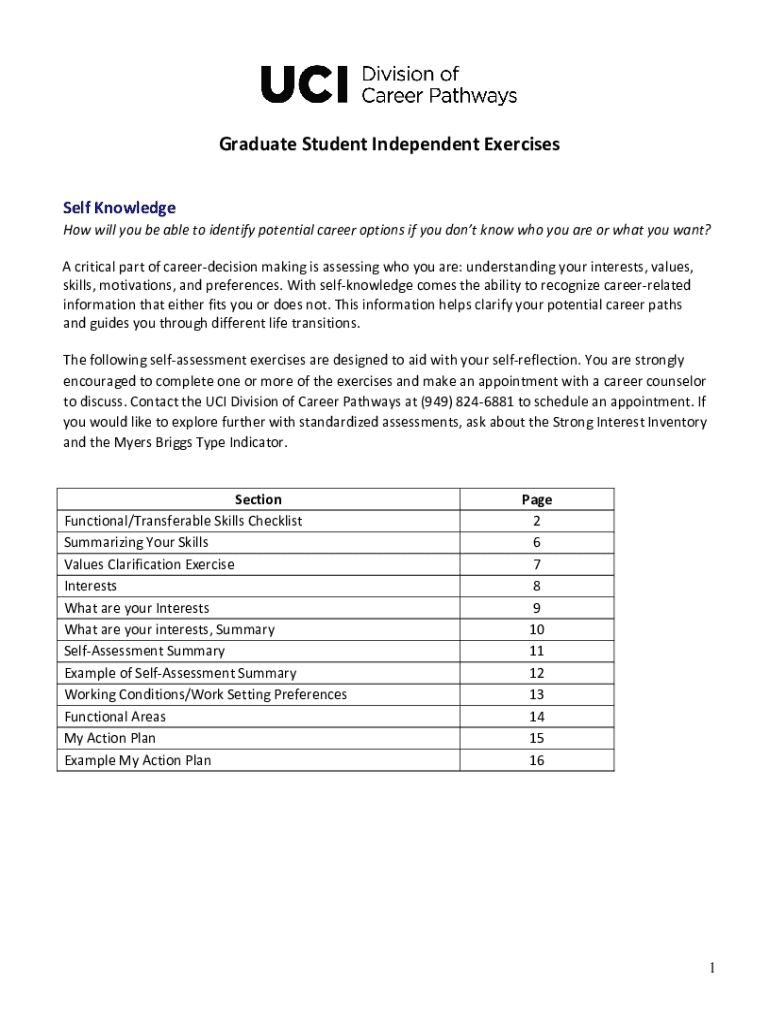 Graduate Student Independent Exercises Self Knowledge How will you be able to identify potential career options if you don't know who you are or what you want? A critical part of career decision-making