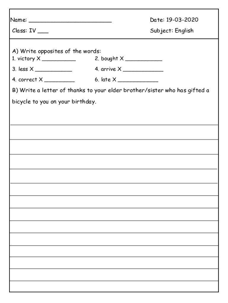 Name: ___ Class: IV ___Date: 19032020 Subject: English) Write opposites of the words: 1. Victory X ___2. Bought X ___3. Less X ___4. Arrive X ___4. Correct X ___6. Late X ___B) Write a letter of thanks
