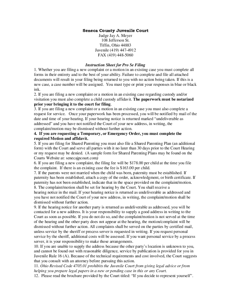Seneca County Juvenile Court Judge Jay A. Meyer 108 Jefferson St. Tiffing, Ohio 44883 Juvenile (419) 4474912 FAX (419) 4485060 Instruction Sheet for Pro Se Filing 1. Whether you are filing a new complaint