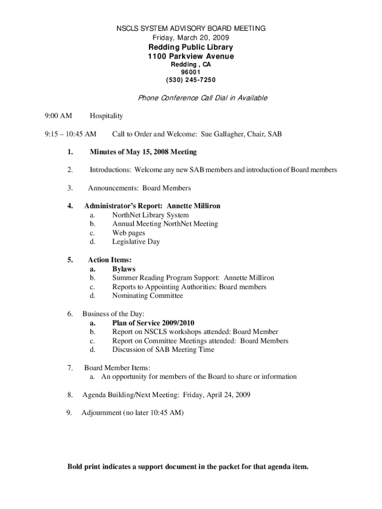 NS CLS SYSTEM ADVISORY BOARD MEETING Friday, March 20, 2009, Redding Public Library 1100 Park view Avenue Redding, CA 96001 (530) 2457250Phone Conference Call Dial in Available 9:00 AMHospitality9:15