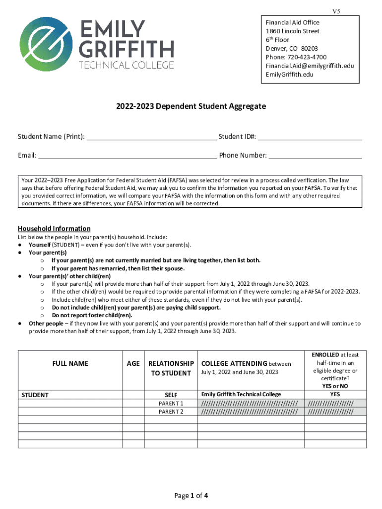 V5Financial Aid Office 1860 Lincoln Street 6th Floor Denver, CO 80203 Phone: 7204234700 Financial.Aid@emilygriffith.edu Emily Griffith.edu20222023 Dependent Student Aggregate Student Name (Print):