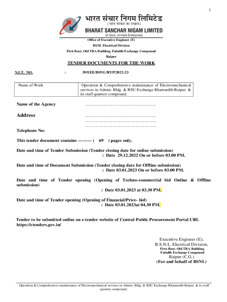 1Office of Executive Engineer (E) BSNL Electrical Division First floor, Old ERA Building, Facade Exchange Compound RaipurTENDER DOCUMENTS FOR THE WORK N.I.T. NO. Name of Work:39/EEE/BSNL/RAP/202223Operation