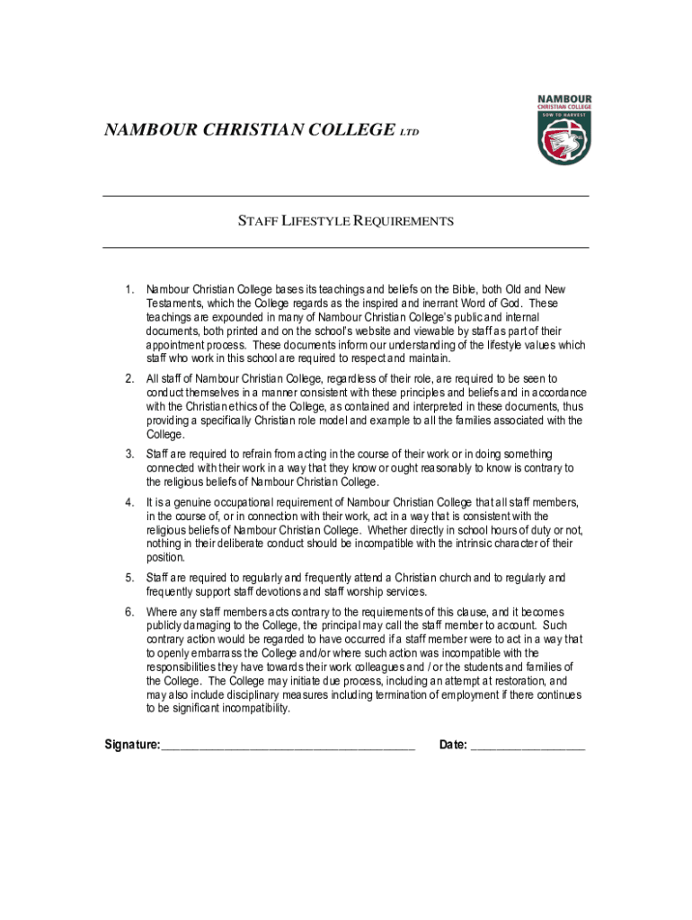 BARBOUR CHRISTIAN COLLEGE STAFF LIFESTYLE REQUIREMENTS1. Seymour Christian College bases its teachings and beliefs on the Bible, both Old and New Testaments, which the College regards as the inspired